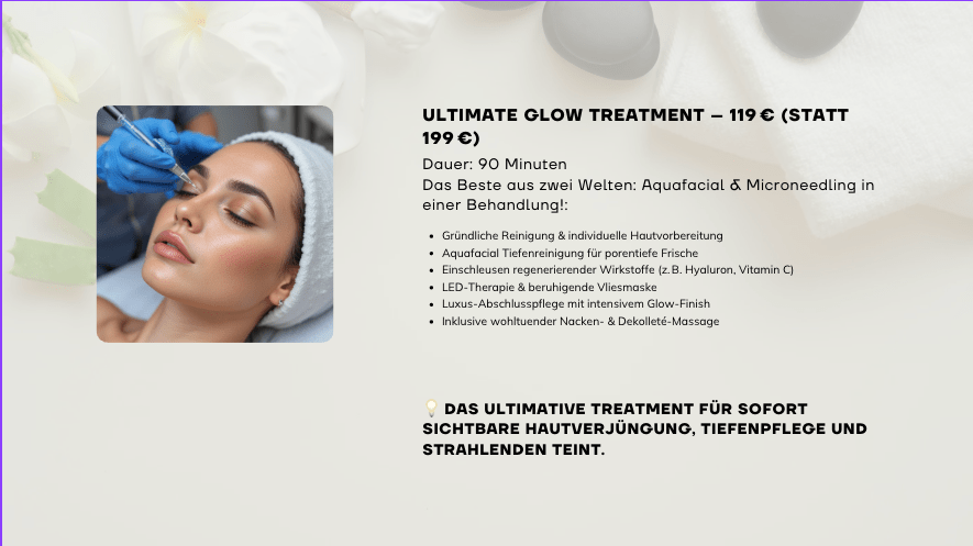 Strahlender Teint mit Soforteffekt Diese innovative Behandlung verleiht der Haut einen natürlichen, ebenmäßigen Glow – ganz ohne Make-up. Ideal bei fahlen Hauttönen, Pigmentflecken oder für alle, die sich einen dauerhaft frischen Look wünschen. Optional mit aufhellender Wirkung für einen klareren Hautton.